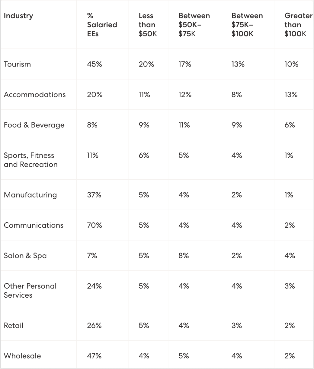 Top 10 highest industries in terms of layoffs of salaried positions, % of workers laid off by income group (data from Gusto):