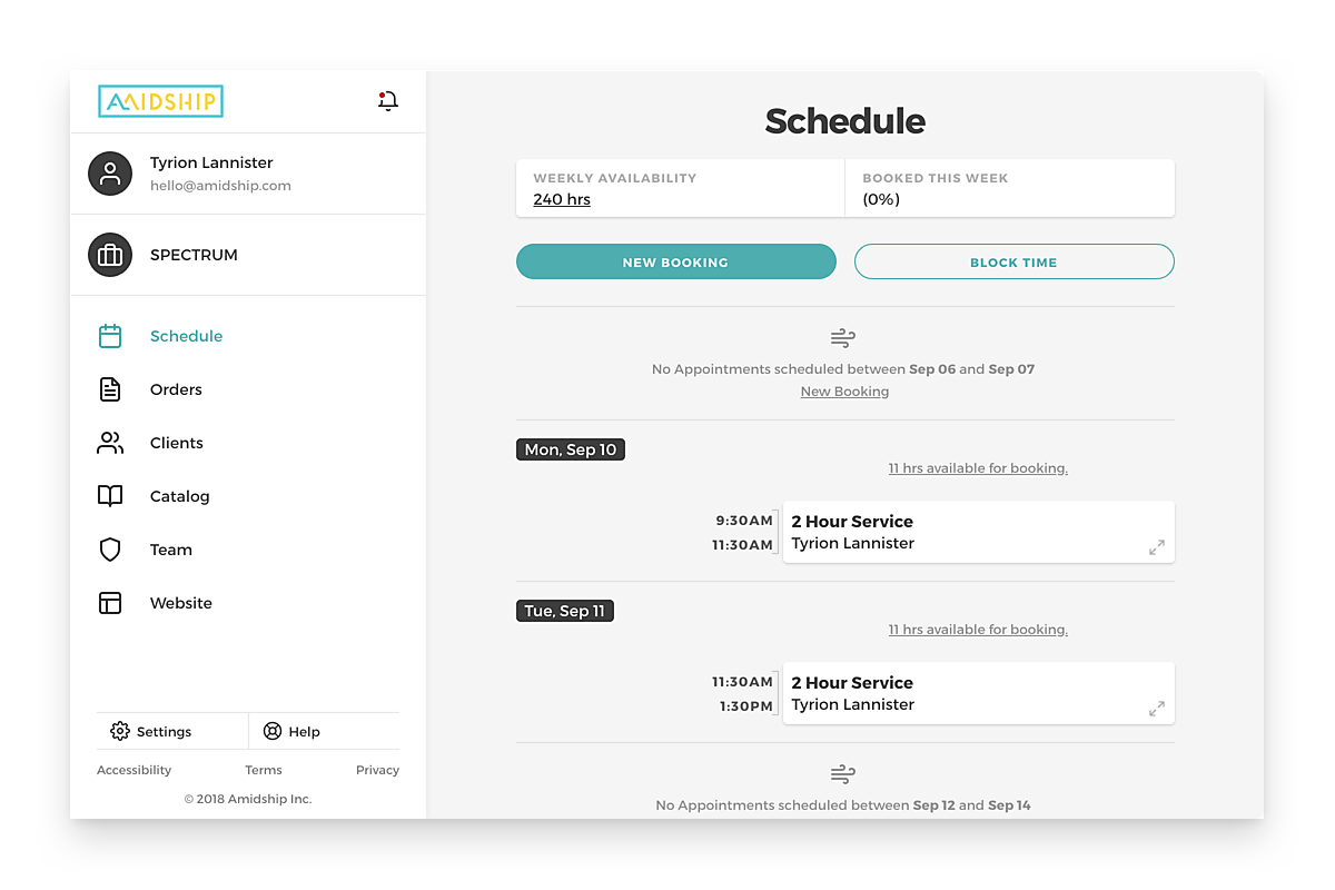Amidship is a small business platform. We help you build your website, manage your schedule, and track your sales - all in one place.